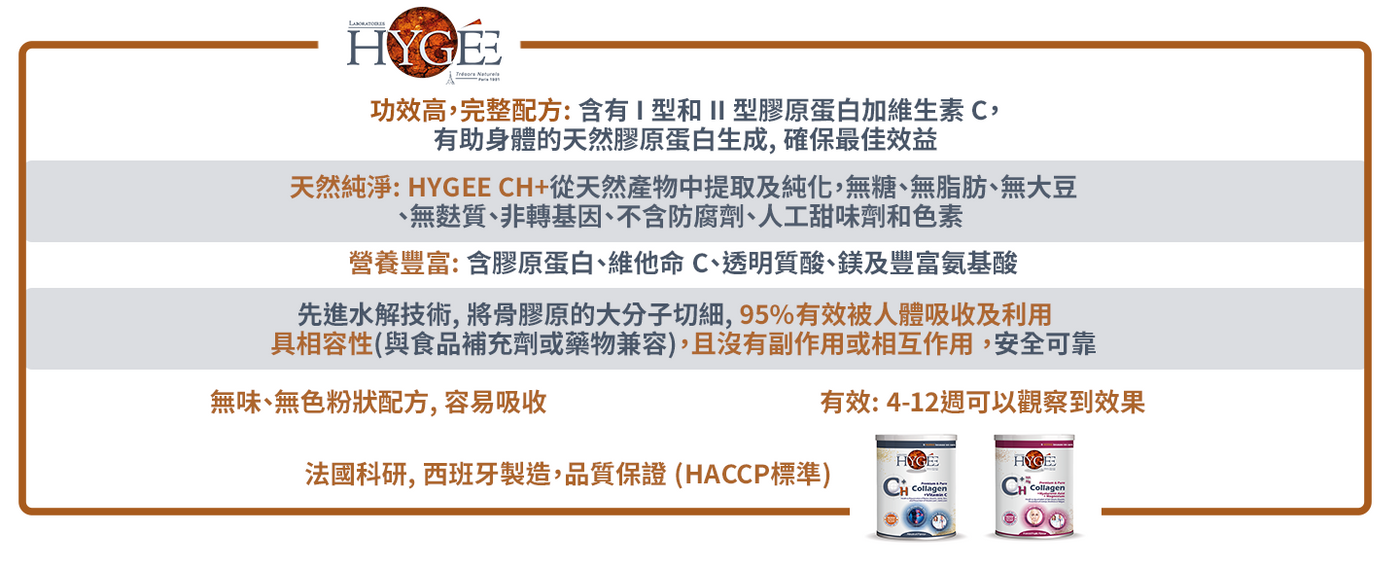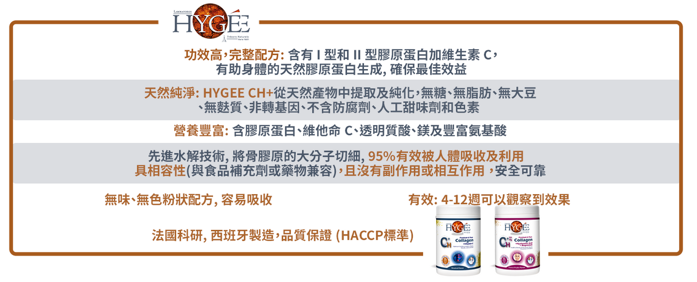 HYGEE CH+ 美肌活齡配方除了關節, 骨骼, 肌肉護理外, 並保護你的身體免受日常壓力, 及恢復肌膚自然美及容光煥發